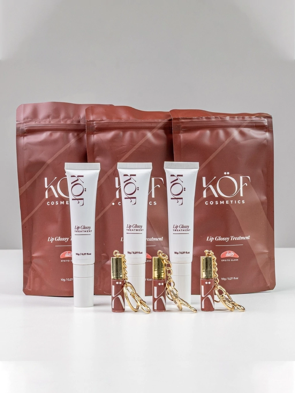 Uma compra só, cuidado multiplicado. O Trio Glossy vem com 3 Lip Glossy Treatments + 3 Minis Glossy, perfeito pra quem quer fazer estoque, dividir com as amigas ou montar kits de presente.